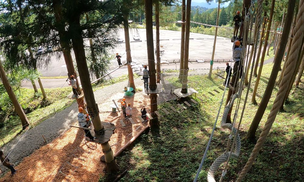 ひるがの高原で、思いきり体を動かして遊びたい方におすすめなのが「ウッドアドベンチャー郡上&巨大迷路」です。郡上ヴァカンス村ホテルの敷地内にあり、地上8mの高さに設けられた空中アスレチックと、岐阜県内最大級となる約1,200㎡の巨大迷路を楽しめます。スリルを味わいたい方も、家族みんなでわいわい遊びたい方も、一緒に満喫できるスポットです。