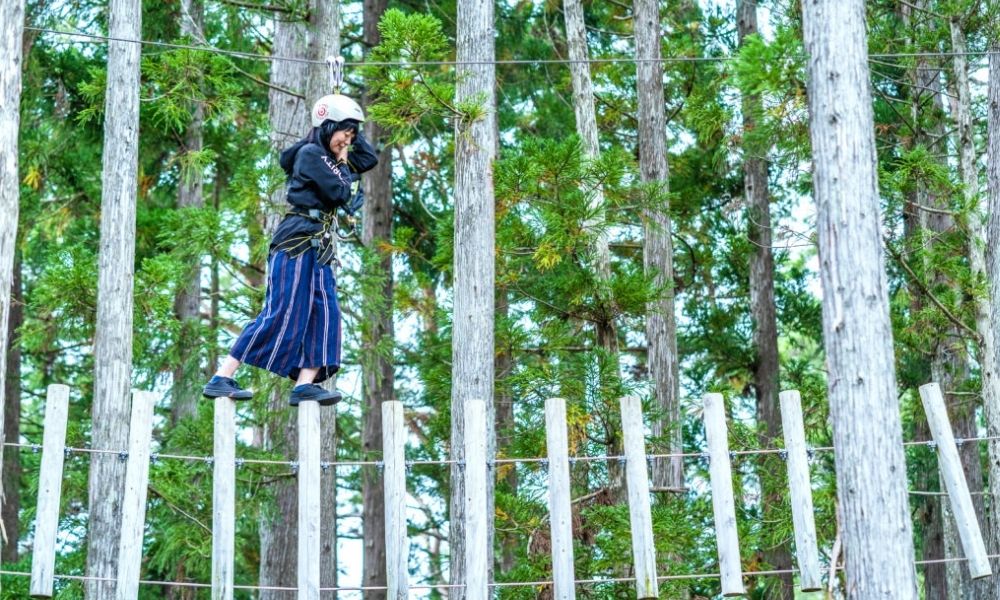 鷲ヶ岳スキー場にあるこのアクティビティは、フランス生まれのウッドアスレチックで、森の中に設けられたコースを進みながら、頭と体をフルに使って楽しめる本格派。自然の中で思いきり体を動かしたい方にぴったりのスポットです。