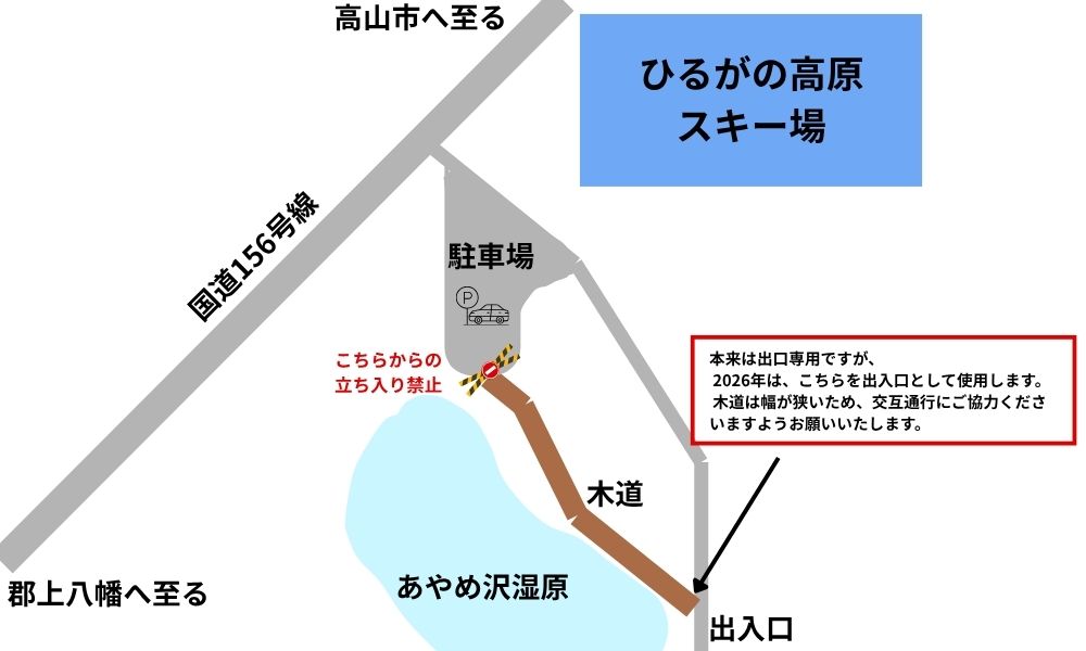 このページでは、ひるがの高原に咲き誇るミズバショウの開花状況を、速報としてまとめます。なお、一番大きな群生地である「あやめ沢湿原」ですが、散策用の木道が2025年の豪雪と経年劣化により被害が出まして、2026年をもって全撤去される方針となりました。(早ければ5月末頃には撤去工事に入る予定です。)このシーズンについても、本来一方通行でご覧いただける木道ですが、入り口部分の損傷が激しいため、出口専用としているところを「出入口」とし、交互通行で木道を利用していただきます。あらかじめご了承ください。